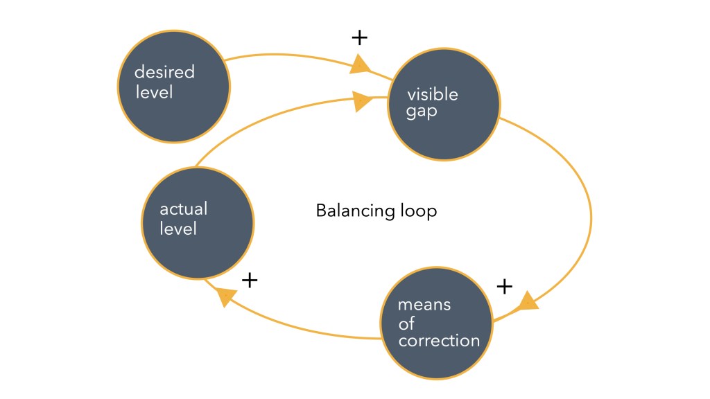 Because the goal in ‘+’ balancing loop is often implicit, it can be difficult to realise that a ‘-‘ balancing process is at work. It’s important to find the implicit goals in the system from a particular perspective – the ‘rationale’ that is driving actions, as this will determine the nature of the corrective action.