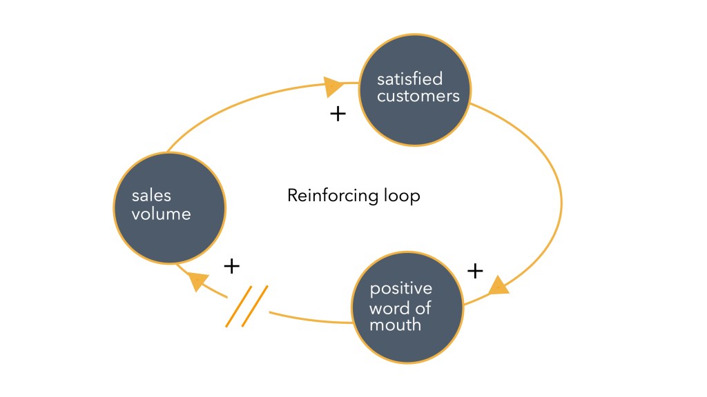 In a reinforcing loop, change in one direction is compounded by more change. A positive example might be: